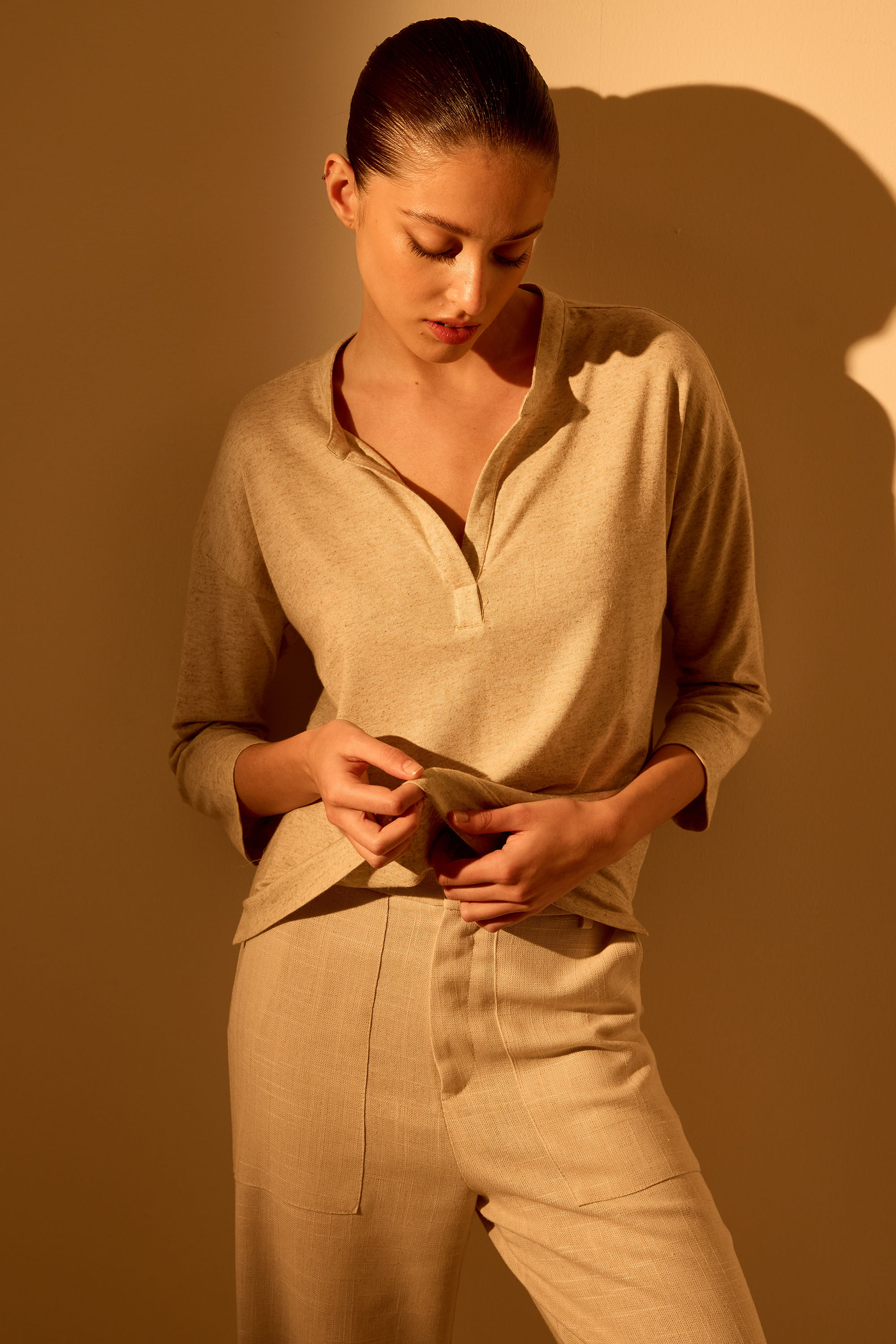 Composição 56% Viscose 37,5% Linho 6,5% Elastano