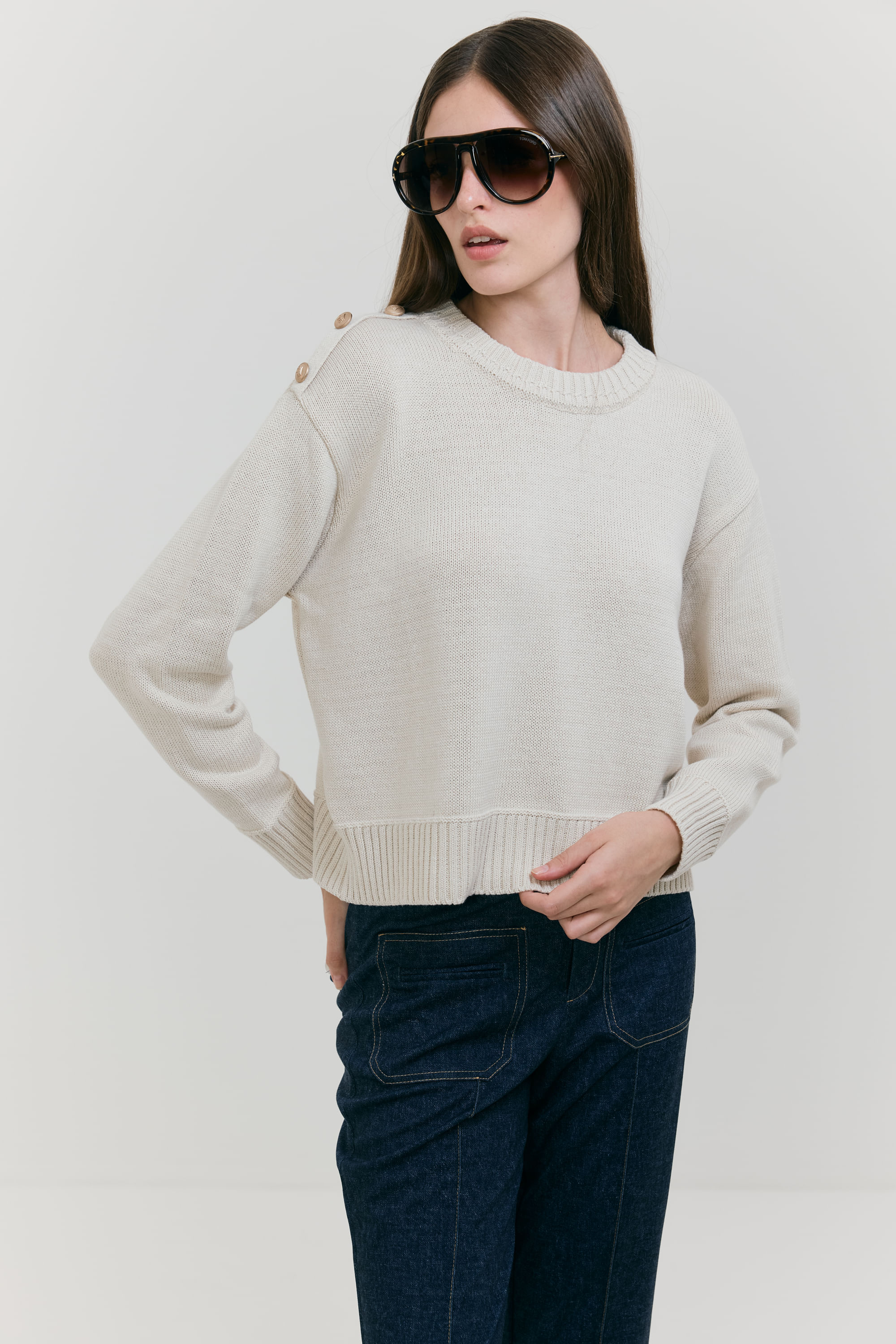 Blusa Pull Tricot Botões Ombro - BEGE