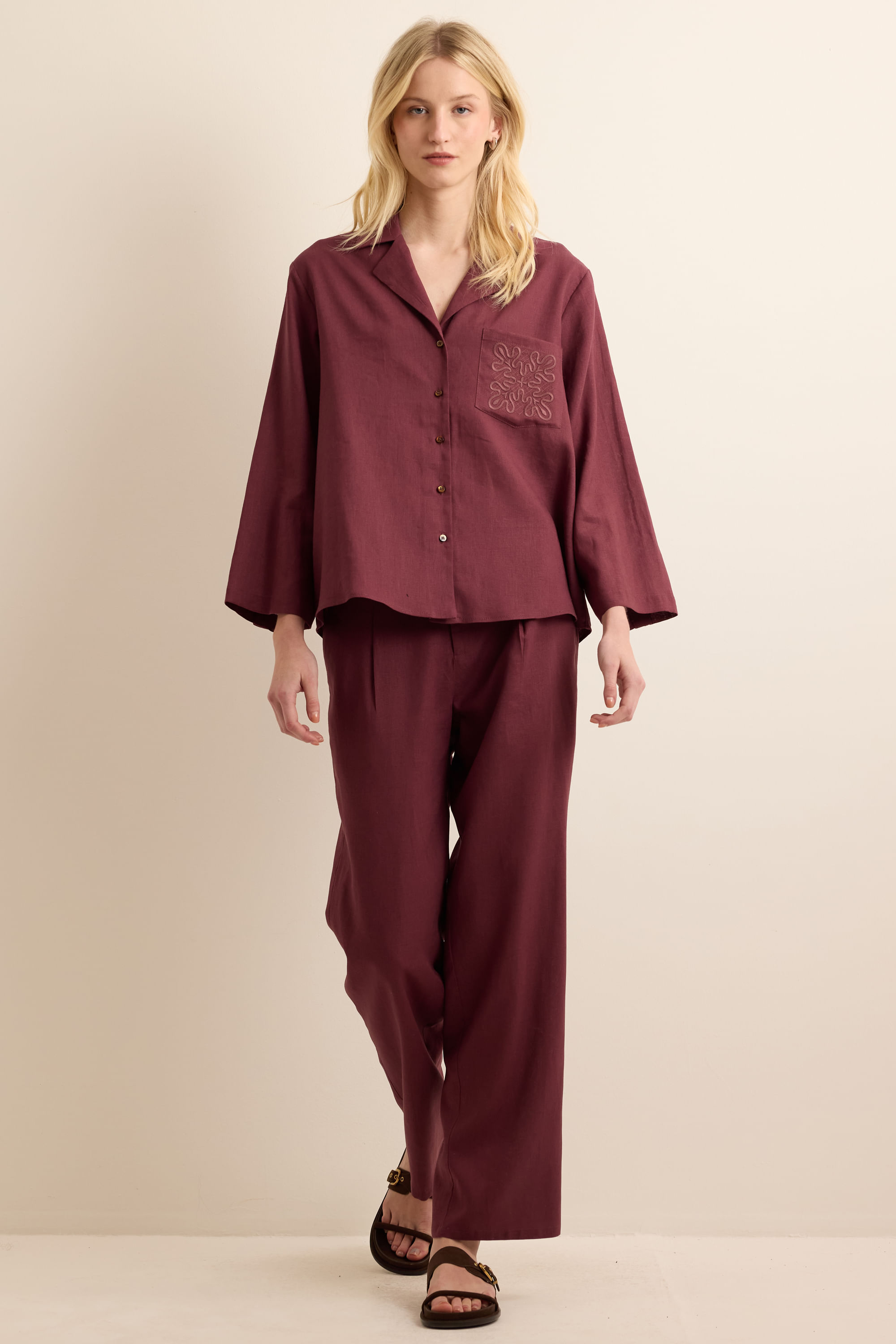 Calça Com Linho Reta - VINHO
