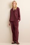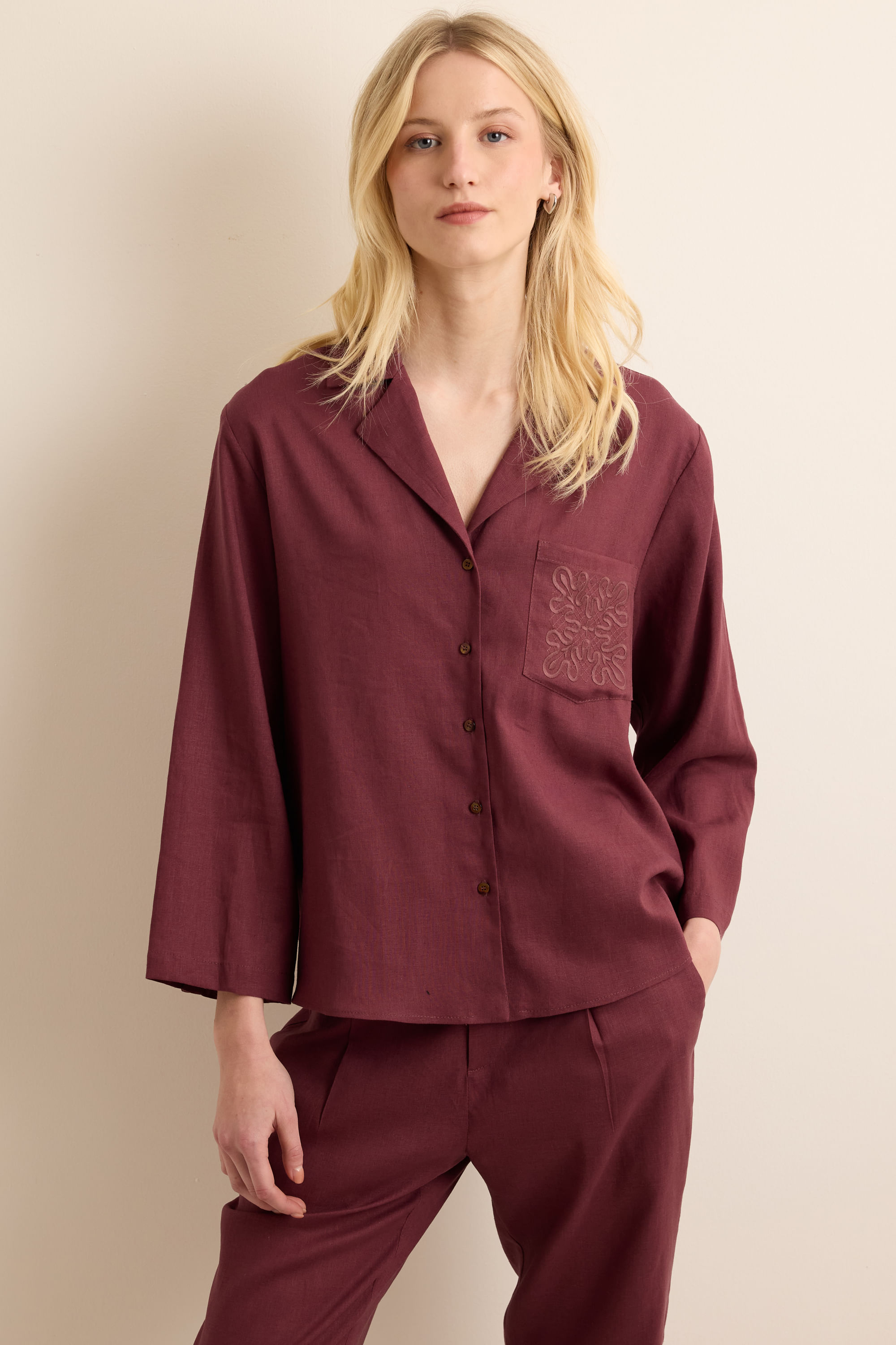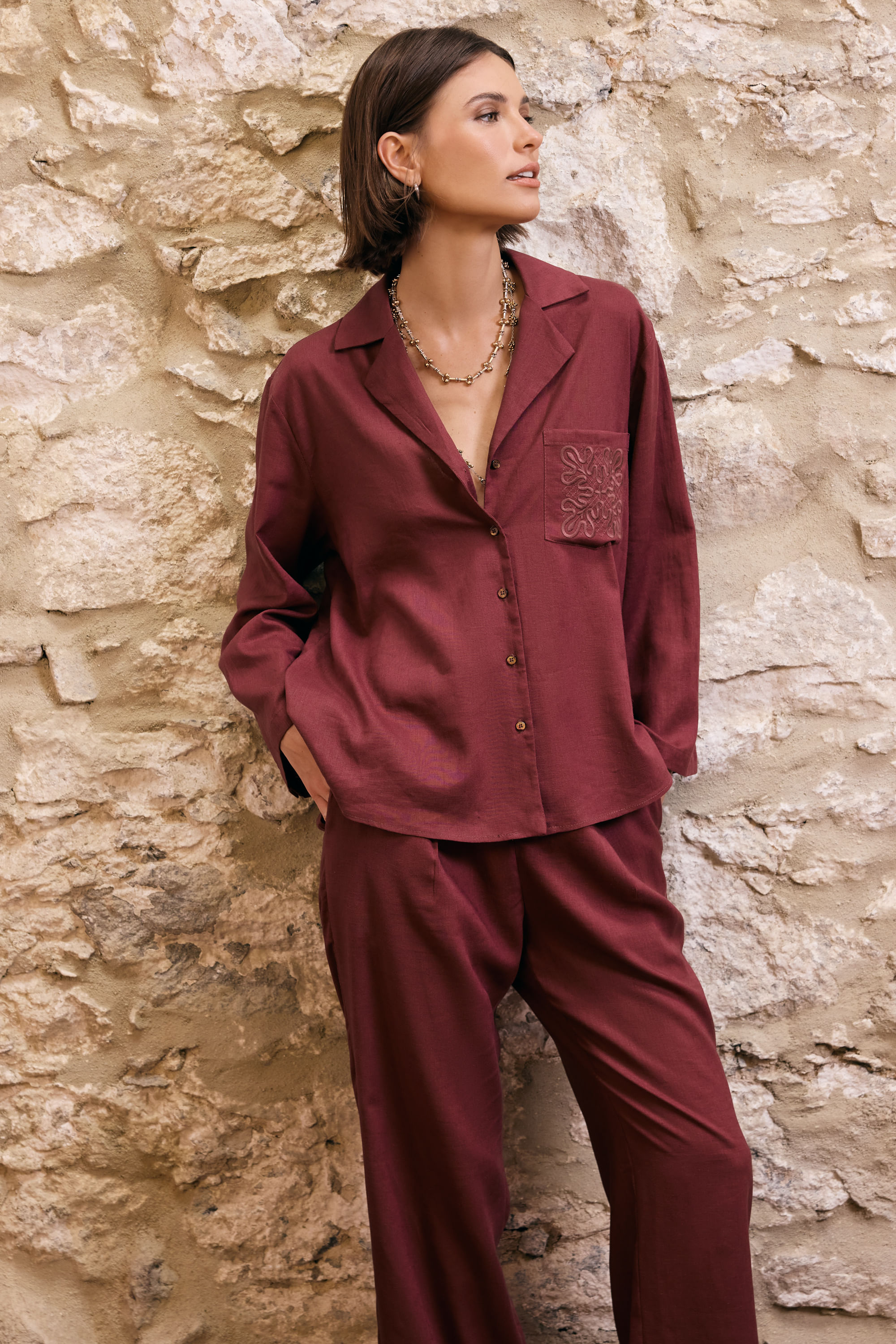 Camisa Com Linho Bolso Bordado - VINHO