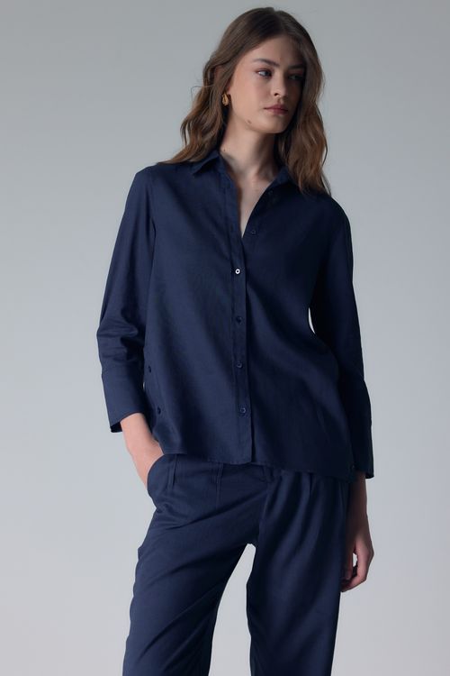 CAMISA COM LINHO BOTÕES LATERIAS - AZUL MARINHO