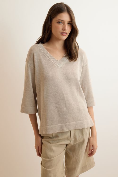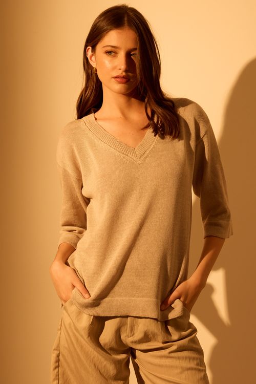 Blusa Tricot Gola Triangulo Botões - MARROM
