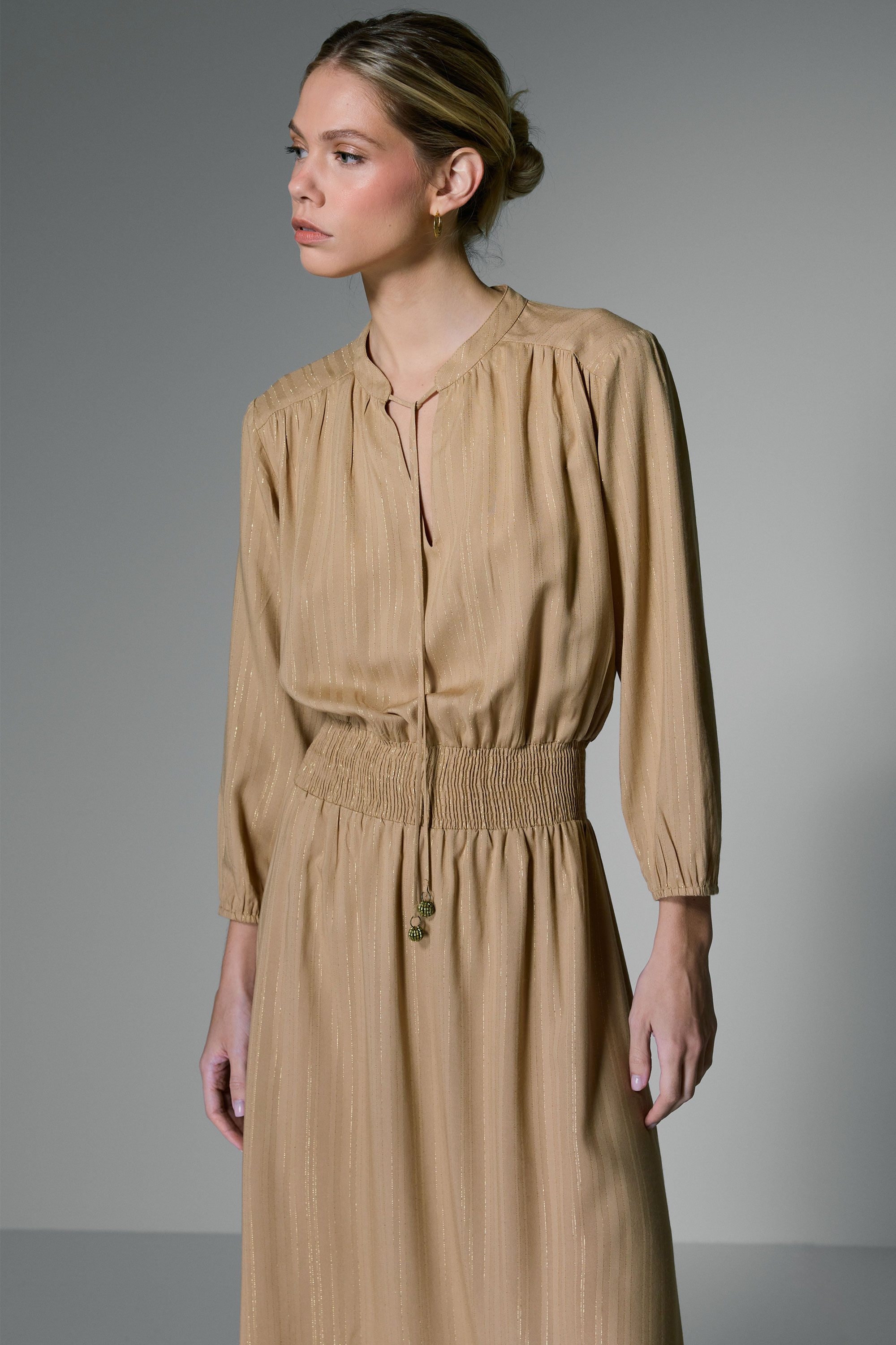 VESTIDO METALIC STRIPE LASTEX - CAQUI